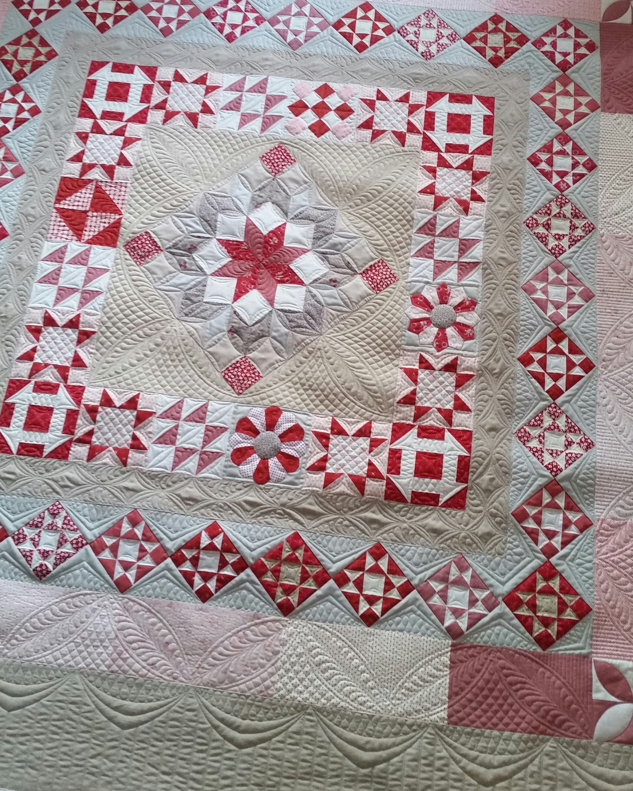 Custom Quilting betyr at quiltingen tilpasses teppets blokker og border. Du velger luftig eller tett quilting. Dette er "skreddersydd" quilting for ditt teppe.